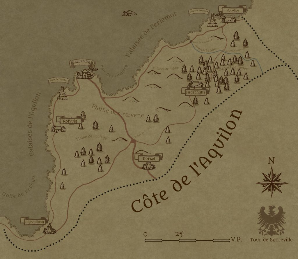 Cette carte présente une région du nord de l’Ouravie, proche des Iles Pryor. Dans le cadre du conflit entre les deux puissances, la Côte de l’Aquilon est un bon exemple de la diversité des origines des habitants de l’Empire. Les villes côtières sont peuplées en partie de Pryoriens, qui marchandent sur les mers. La guerre a entraîné l’interdiction du commerce, provoquant la colère des habitants qui jettent la faute sur les Pryoriens expatriés. Ces derniers continuent à traiter avec leurs cousins du nord, créant ainsi un réseau de contrebande.