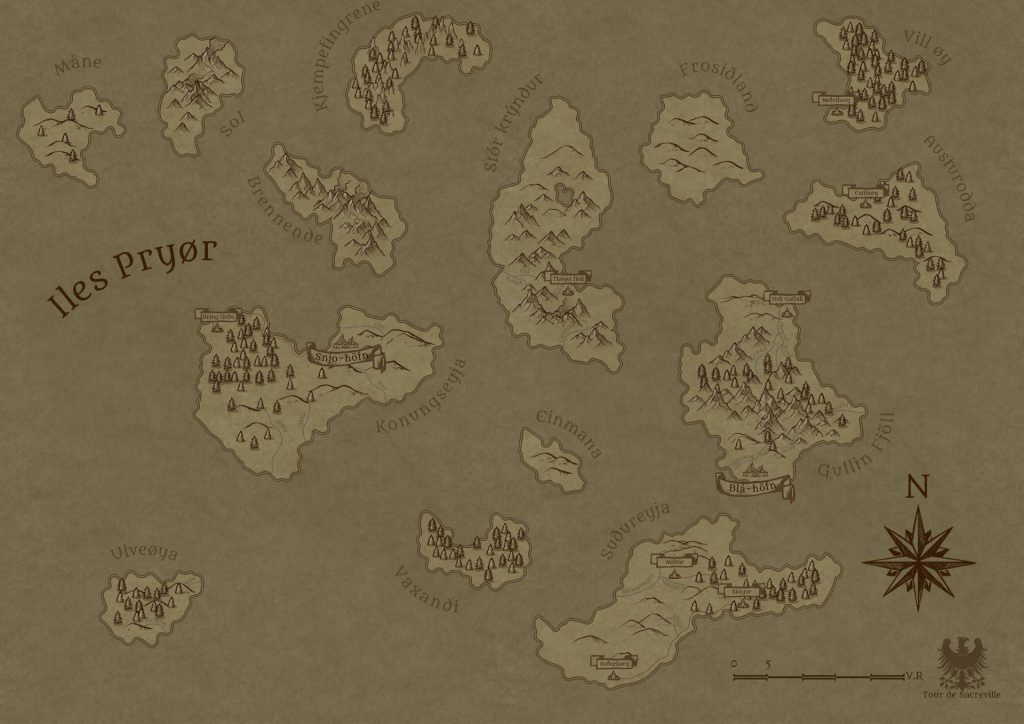Les toponymes présents sur la carte sont tous inspirés de l’islandais ou du norvégien. L’île de Sudureyja tire par exemple son nom de l’islandais pour « Ile du sud ». « Bla-Hofn » est une approximation de « Port bleu ». Les deux îles de Mane et de Sol tirent leur nom du norvégien pour « Lune » et « Soleil ».