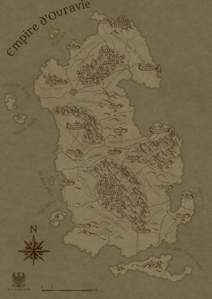 Selon la tradition ouravienne, les distances se mesurent en Volées (d’après l’aigle, symbole de l’empire ouravien comme de plusieurs empires historiques) : l’unité de base est la Volée Princière, qui correspond à un peu plus d’un 1.5 kilomètres. Sur la carte ci-dessus, les distances sont calculées en Volées Impériales ; une Volée Impériale correspond à un peu plus de 150 kilomètres.