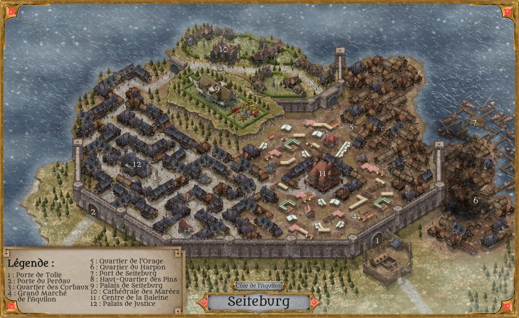 Seiteburg est le chef-lieu de la Côte de l’Aquilon. Le quartier de l’Orage est un quartier pauvre, situé près du port et du quartier du Harpon, situé à l’extérieur de la ville. Le quartier du Harpon abrite les nombreux entrepôts où sont gardés les produits de la pêche et de la chasse à la baleine ; on y trouve également de nombreux fours permettant d’extraire la précieuse huile de baleine qui a fait la réputation de la ville. Ces fours produisent une épaisse fumée noire quise propage souvent sur le quartier de l’Orage. Enfin, le Haut-Quartier des Pins abrite l’élite de la ville : positionnée en hauteur et protégée par d’autres murs, le quartier est à l’abri à la fois des troubles de la ville et des émanations du port.